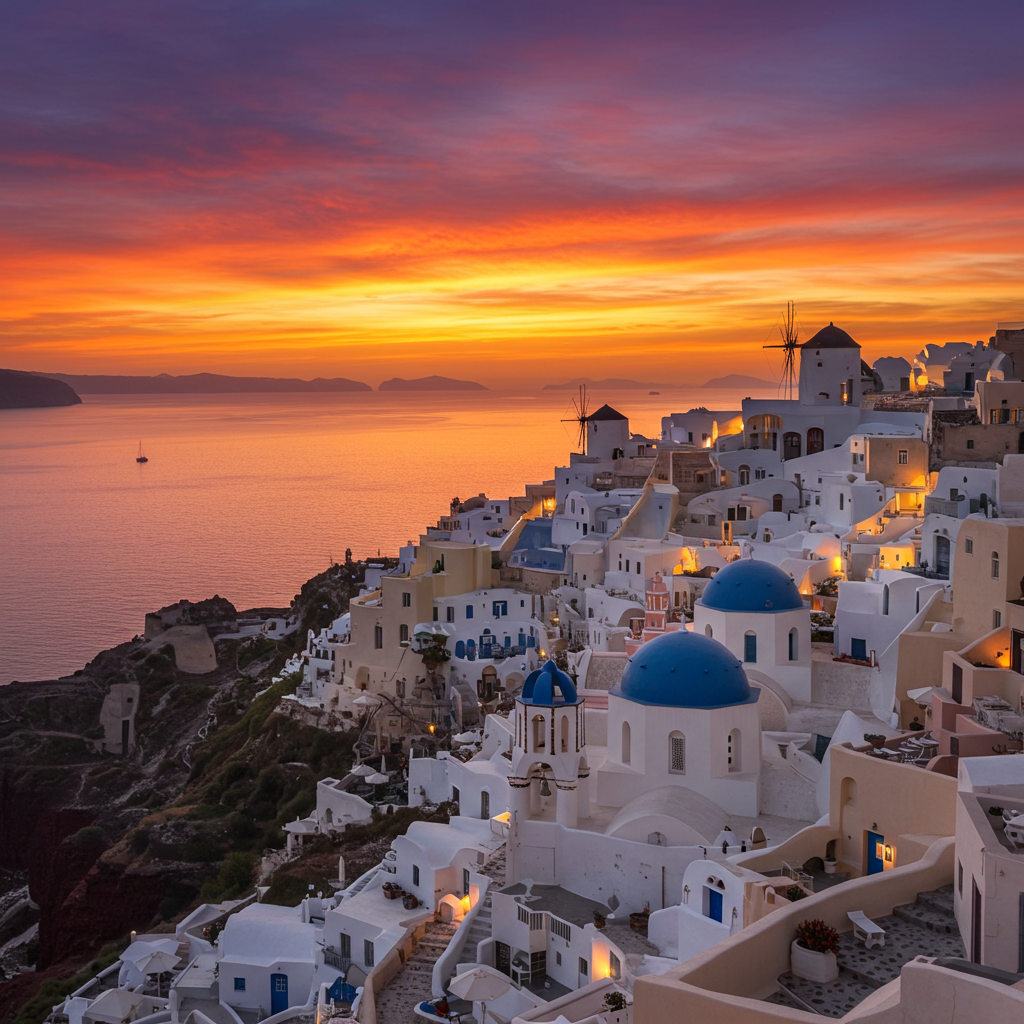 볼드 이아 마을(Oia Village)은 산토리니 석양을 감상하기 가장 유명한 장소로, 하얀 벽과 파란 돔 지붕의 집들이 늘어서 있습니다.