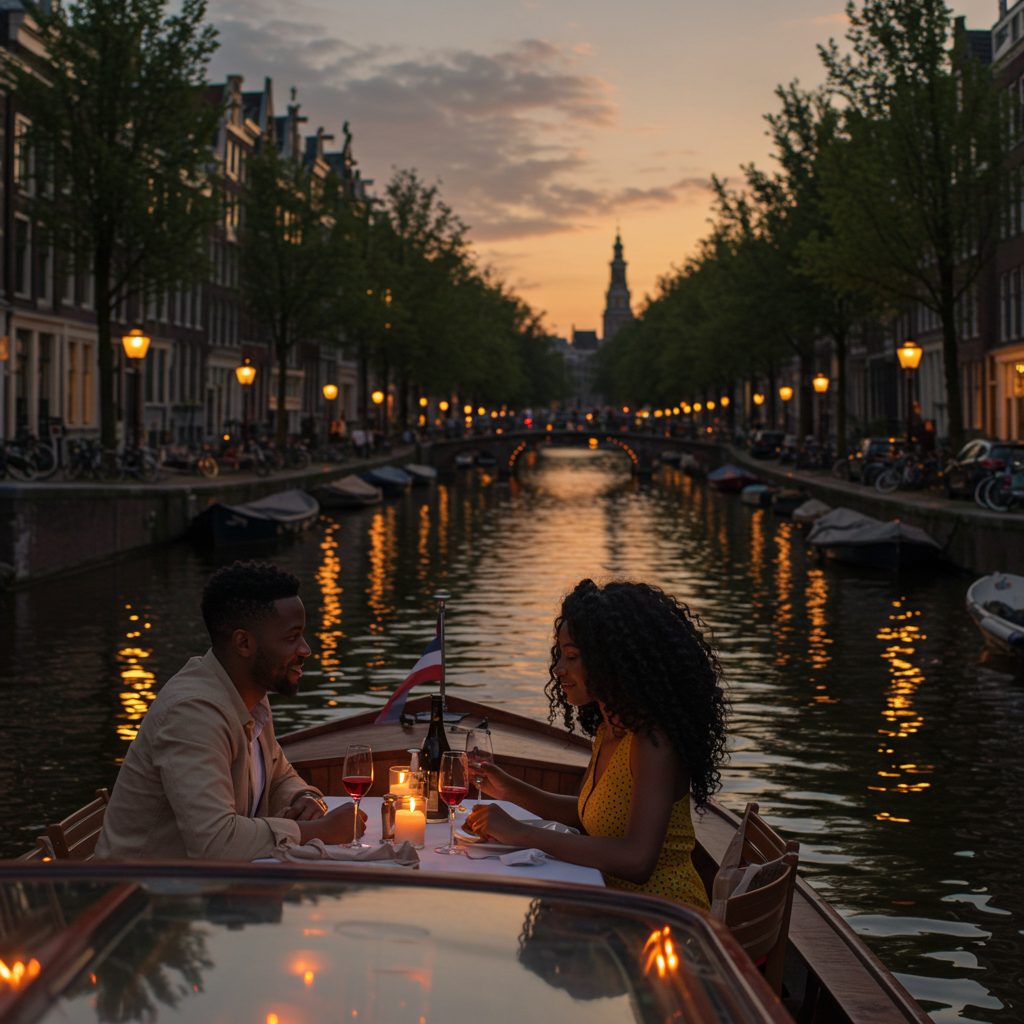암스테르담은 신혼여행지로서 낭만과 자유로움이 가득합니다. 운하 유람선에서 즐기는 와인 디너, 야경 속 반짝이는 다리와 거리 풍경은 특별한 순간을 만들어 줍니다.