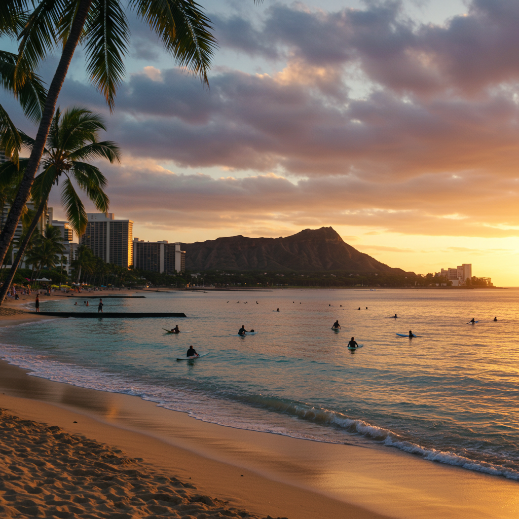 하와이의 대표 명소는 볼드 와이키키 비치(Waikiki Beach)입니다. 호놀룰루 중심에 위치해 서핑, 해양 스포츠, 쇼핑과 레스토랑까지 한곳에서 즐길 수 있는 인기 해변입니다.
