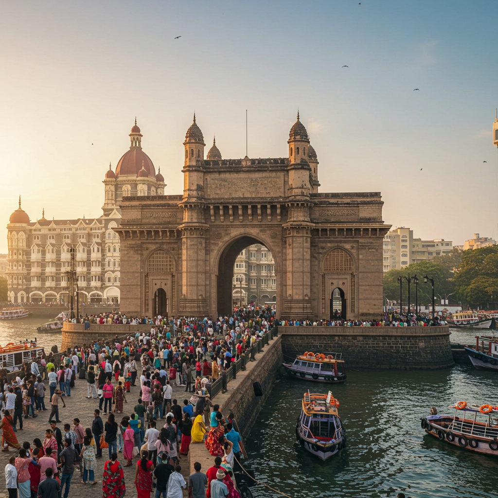 볼드 인디아 게이트웨이(Gateway of India)는 뭄바이의 대표적인 상징으로, 20세기 초 영국 통치 시기에 건설된 웅장한 아치형 건축물입니다.